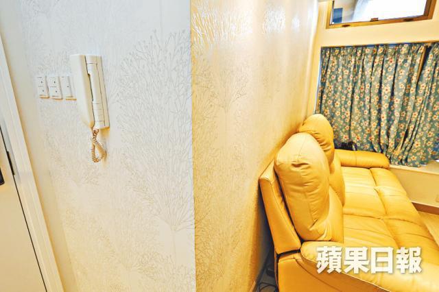 單位牆身髹油為主,只於兩壁鋪牆紙,各有不同作用。一幅在客廳梳化後,找來淺銀灰色樹木圖案,一棵棵幼枝密麻麻,植物清新脫俗,與白色櫃對比和諧。