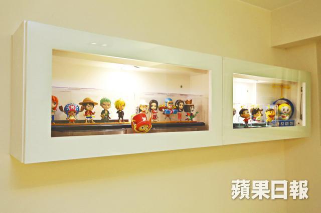 媽媽的動漫公仔包括海賊王、多啦A夢及迪士尼,數量不多,放置飯廳水晶玻璃吊櫃,以及玄關鞋櫃中間層架內,簡單就足夠。玻璃吊櫃十分高,原來為了保留下方空間,日後可以擺放鋼琴。