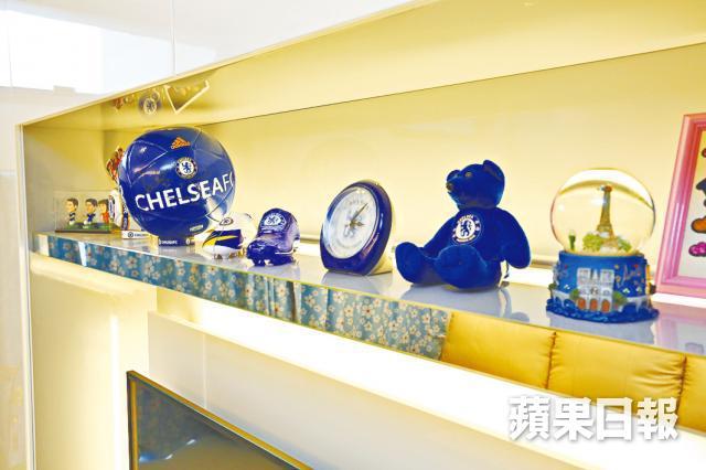 爸爸不但熱愛聖鬥士,也是英國球隊車路士迷,擁有一些紀念品,電視櫃充當飾櫃,特備層架放心頭好,並且發光發亮,櫃側鑲灰玻璃,可以在飯廳及進出走廊時,望到櫃內紀念品。