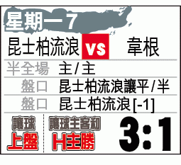 周一英冠升班附加賽準決賽次回合賽事,昆士柏流浪(QPR)與韋根在首回合0:0和局收場,今仗前者回到主場作賽,進攻意欲勢必大增,「入球大細」中位數2.5球,捧入球「大」。(球賽編號:星期一7;無綫網絡電視301台明日2:45am直播)