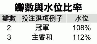 要分析那樣較抵賭,重點就是水位越大越唔抵買,越少瓣數越抵賭(見附表)。今場西甲大戰正正是一個示範好例子!巴塞只要在今場比賽勝出,冠軍就會落在他們手中,所以「主勝」及巴塞的冠軍賠率,均定在1.68倍!但更值得比較馬體會冠軍賠率(2.05)、「和」(3.4)及「客勝」(4.3)。