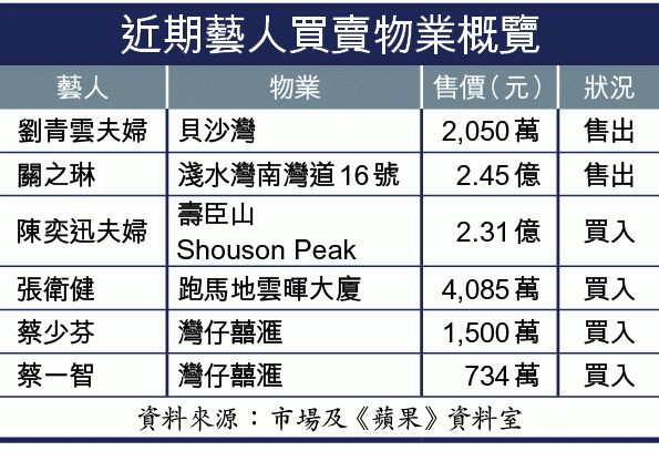【本報訊】樓市走勢仍未明朗,有人睇好亦有人看淡,從近期影星藝人買賣物業便可知一二。早前多位藝人一擲數千萬甚至過億元購買一手豪宅,投資經驗豐富的關之琳上月不惜割價出售南灣道豪宅。出名「識計數」的藝人劉青雲及郭譪明夫婦,日前亦沽出持有超過7年的收租物業薄扶林貝沙灣。