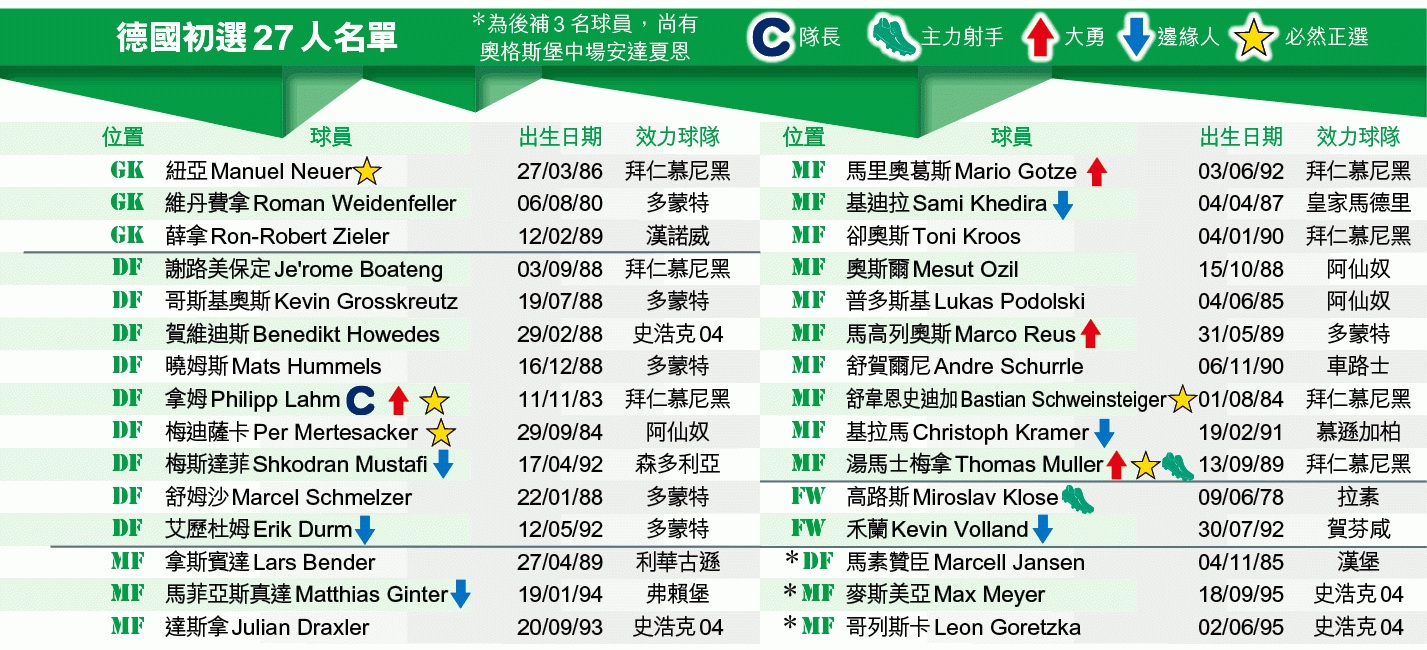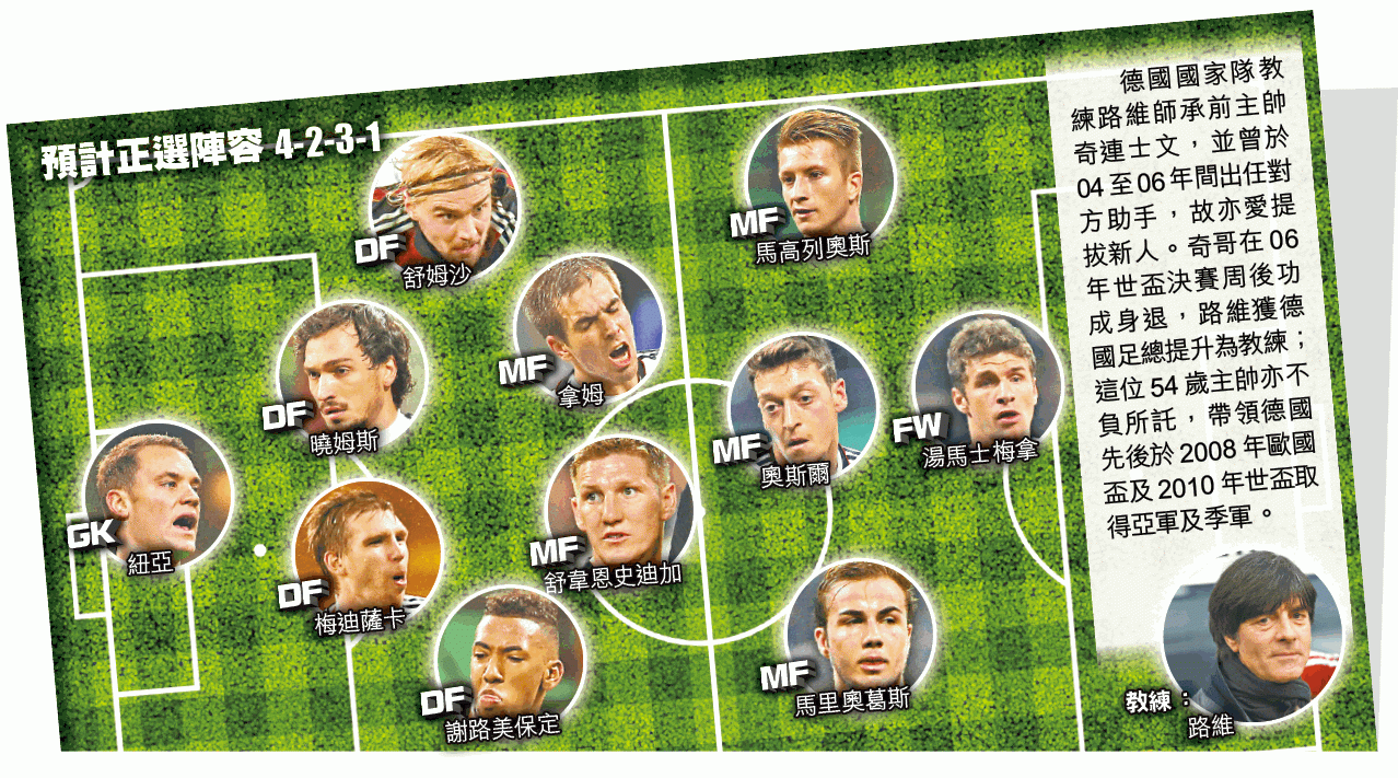 德國隊雖然人才輩出,但前鋒線上仍要依賴已35歲的老將高路斯,成為隱憂。這位老將目前以68個入球,與名宿武勒共同保持國家隊史上最高入球紀錄,但球隊一直未能為他找到合適替補。馬里奧高美斯曾給予德軍希望,但這位28歲的前鋒並沒有在國家隊取得成功,今夏世盃大軍亦榜上無名;觀乎德國隊的初選大軍,正前鋒除高路斯外只見小將禾蘭,最終或須用上湯馬士梅拿、舒賀爾尼或馬里奧葛斯等球員「客串」。另外,若拿姆「複製」拜仁的防守中場位置,兩閘不論起用舒姆沙、謝路美保定等均難以令人安枕。