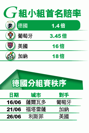 德國於今屆世界盃被編在G組,同組對手葡萄牙、美國和加納在上屆世界盃均打入16強,實力相當平均,要晉級淘汰賽絕不能輕敵。