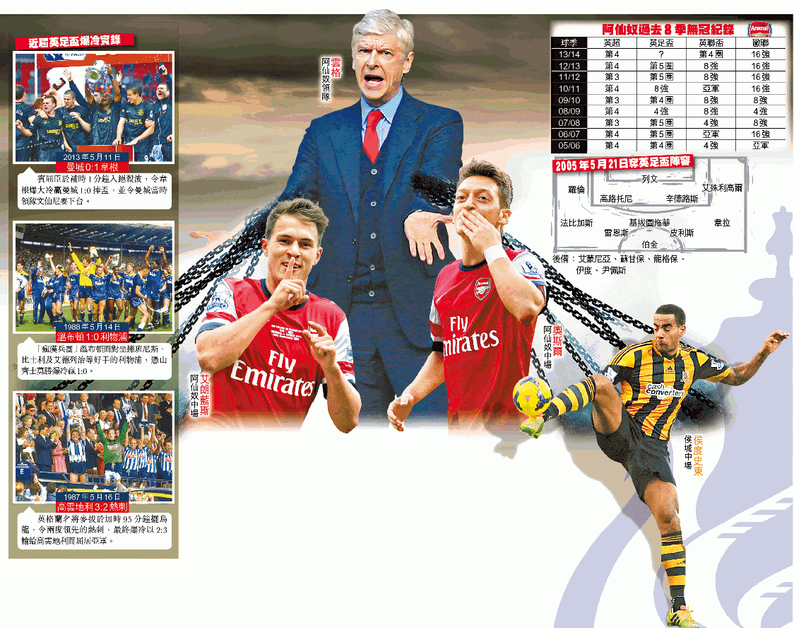 05年5月21日,阿仙奴在英足盃決賽憑12碼擊敗曼聯,讓雲格捧走領軍9季以來第11個錦標。還有4日便已9年,當年場上16名正選與後備已分別退役或離隊,只餘雲格留守;無人質疑雲格18年來為槍手帶來的成就,但其理念以至戰術就像陷入瓶頸。早前拒絕法甲摩納哥招手,雲格在賽前卻像看破紅塵,「你不需背負歷史出戰,要踢得出色只能靠質素及勝利欲望;重要是完成比賽後,若我們感到自己已竭盡所能,就能接受一切結局。」