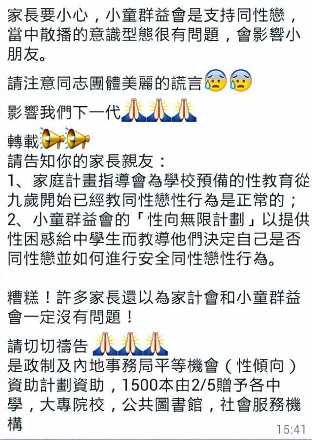 該WhatsApp訊息又指,該會的性向無限計劃,教導性困惑學生決定自己是否同性戀,及進行安全性行為;又指家計會為學校預備的性教育,教人同性戀是正常,令人感「糟糕」。
