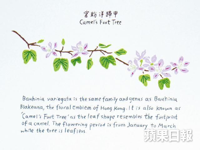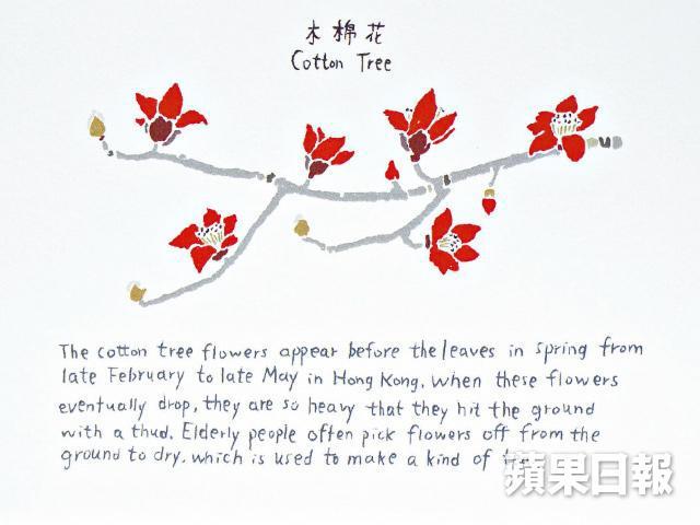 賞樹遊除了拍照,插畫師Furze Chan(陳嘉儀)最近與本地設計店SOIL合作推出一套12款香港花卉明信片,希望大家多關注本地植物,頭炮4款為宮粉洋蹄甲、薑花、香港茶,還有她最喜歡的木棉樹,「小時候住觀塘順利邨,種了很多木棉,試過執種子回家種,長到15厘米便死掉了。」