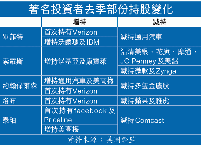 至於另一大鱷索羅斯(George Soros)旗下基金,去季悉數沽售持有的多家美國大銀行的股票,其中包括美銀、花旗及摩根大通,同時亦沽清兩隻重磅股美鋁及JC Penney。與此同時,索羅斯亦減持兩科技股Zynga和微軟股票。