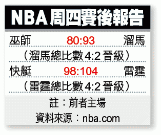 而東岸決賽則重演上屆戲碼,由溜馬挑戰熱火。東岸1號種籽溜馬周四作客巫師,憑老將大衛韋斯繼續擔起帶領球隊的重任,交出全場最高的29分,以93:80再勝一場,總比數勝4:2出線。不過,今場大衛韋斯與保羅佐治曾就防守問題上出現口角,隊中內訌問題似乎仍未徹底解決;面對終極強敵熱火,軍心不穩或會是一大隱憂。