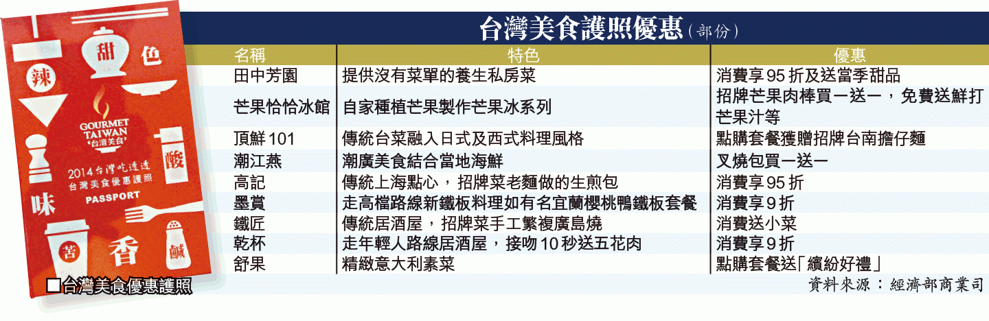 台灣行政院即日起至7月31日間,在港推出台灣美食優惠護照。行政院經濟部商業司專門委員許福添指出,去年在港首推優惠護照,反應熱烈,今年續推,嚴選約100間既保留台灣傳統、又經創新改良的「台味」食肆。