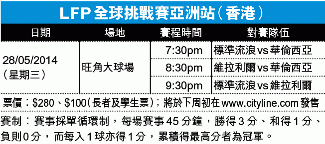 【LFP全球挑戰賽亞洲站(香港)】280元睇西甲雙雄!港甲標準流浪將於本月28日與西甲的華倫西亞及維拉利爾,假旺角場角逐LFP全球挑戰賽。主隊昨宣佈賽事詳情,除正價門票只需280元外,兩外隊亦表明強陣出擊,保證抵睇又好睇!