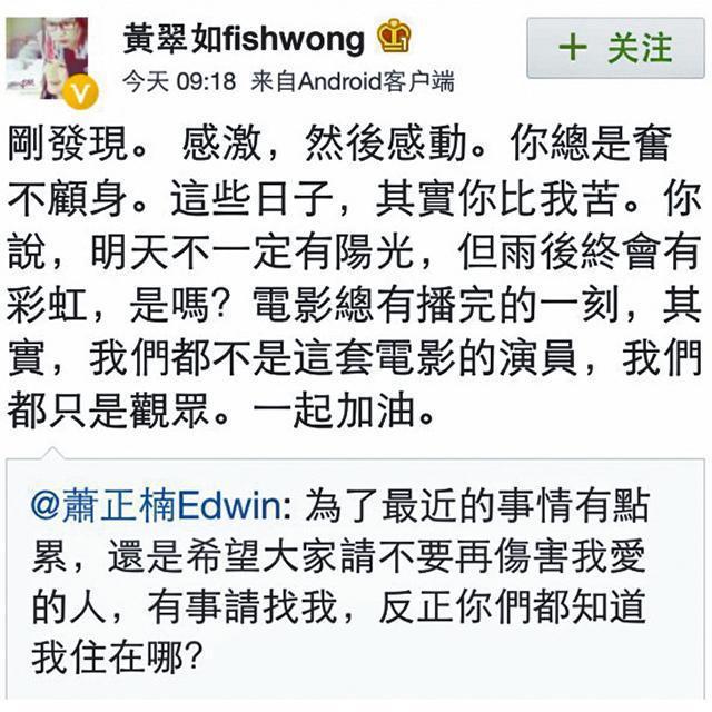 翠如BB昨早不但轉發男友蕭正楠愛的宣言示威,她又回覆:「剛發現。感激,然後感動。你總是奮不顧身。這些日子,其實你比我苦。你說,明天不一定有陽光,但雨後終會有彩虹,是嗎?電影總有播完的一刻,其實,我們都不是這套電影的演員,我們都只是觀眾。一起加油。」隔空向蕭正楠傳情。