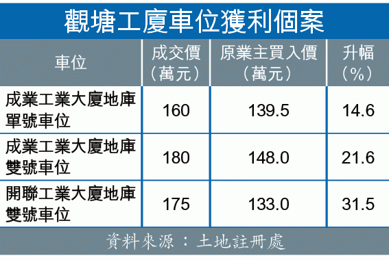 根據土地註冊處資料,觀塘成業街成業工業大廈地庫單號車位,買家於2013年8月以139.5萬元買入,今年3月以160萬元易手,持貨半年,急賺20.5萬元或14.6%。但也不及同一工廈內,另一個地庫雙號車位,原業主去年12月以148萬元買入,今年4月以180萬元沽出,據悉,買賣車位需付六成首期,本金約88.8萬元,三個多月賺32萬元或21.6%。