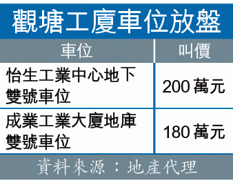 目前觀塘區工廈車位放盤少,僅約10個,叫價介乎120萬至200萬元,其中開源道及成業街的工廈車位叫價較高,如開源道55號開聯工業中心單號車位,叫價200萬元。