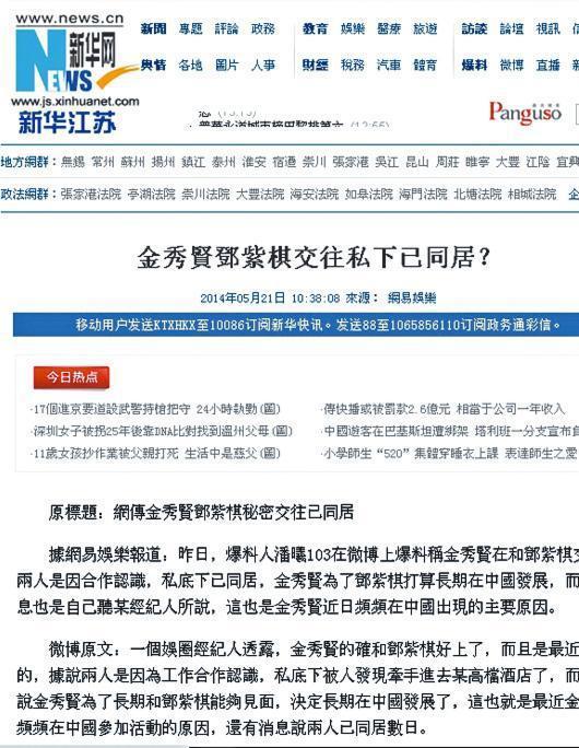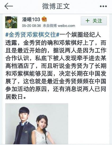 事緣前日有署名「潘曦103」的內地網民在微博爆料,言之鑿鑿地驚爆金秀賢和G.E.M.暗交兼同居:「一個娛圈經紀人透露,金秀賢的確和鄧紫棋好上了,而且是最近開始的,據說兩人是因為工作合作認識,私底下被人發現牽手進去某高檔酒店了,而且聽說金秀賢為了長期和鄧紫棋能夠見面,決定長期在中國發展了,這也就是最近金秀賢頻頻在中國參加活動的原因,還有消息說兩人已同居數日。」