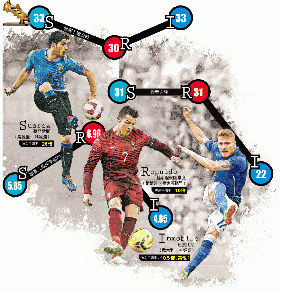 近年能夠於同年連贏聯賽神射手與世盃金靴獎的人不多。蘇亞雷斯(阿蘇)、基斯坦奴朗拿度(C朗)和恩莫比尼3位聯賽神射手,在今屆決賽周各有隱憂,要力爭成為雙料神射手,非施渾身解數不可。