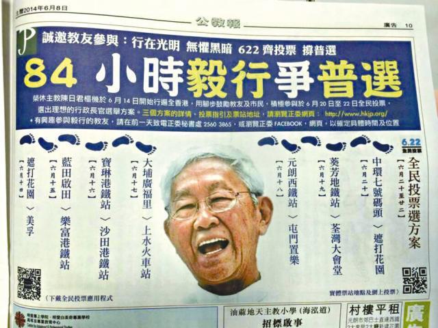 天主教正義和平委員會幹事孔令瑜說,年逾80的樞機為了爭民主、爭普選都願意行出來毅行七天,她希望刊登廣告後有更多市民及教友響應。