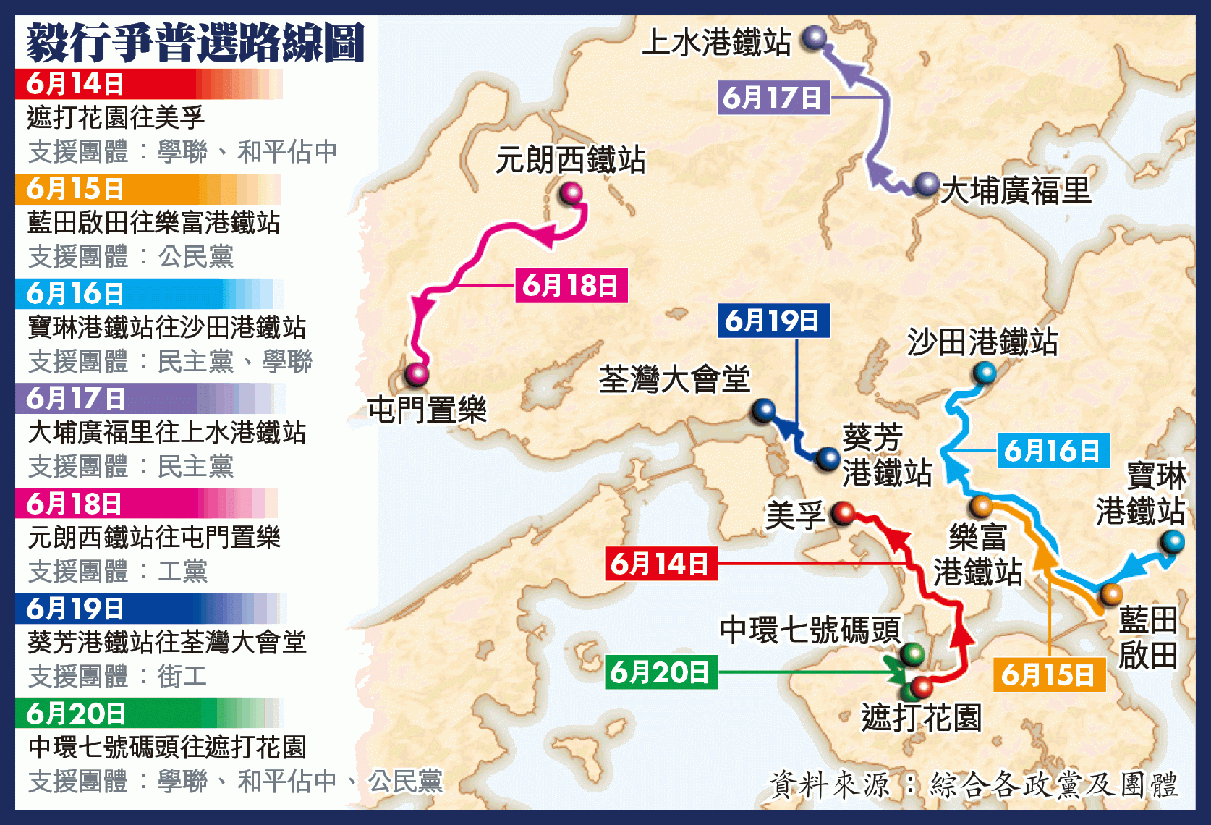 據了解,陳日君、李柱銘、余若薇等「主力」有8至10人,料行勻各區,而各泛民政黨、民間團體就會在各區設街站作宣傳,每條路線亦有不同人加入,如公民黨主席梁家傑就會參與藍田至樂富一段的毅行。
