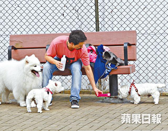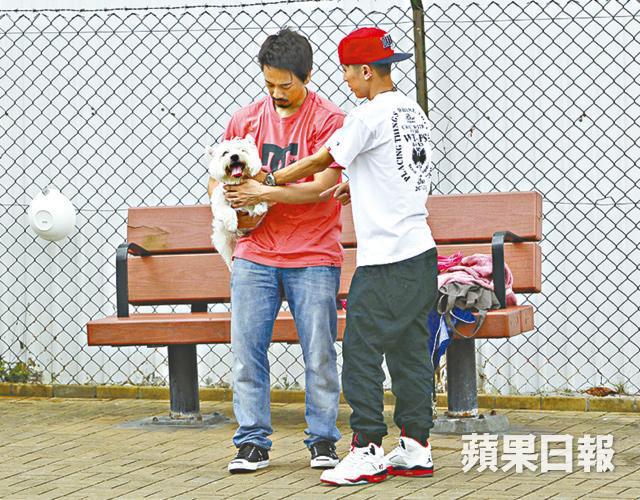 當日約下午4時,Eric完成工作,即坐保母車飛奔回家接兩隻高地白嗲利愛犬Toro和Nana,再直駛北角狗公園,Eric先從一個大袋拿出足球與愛犬玩掟波,一輪熱身後,訓犬師Ben向Eric作出指導,Eric隨即向兩愛犬發出sit指令,兩犬亦十分聽話,聽到指令便排排坐,然後見Eric多次練習將愛犬抱起擁入懷的動作,雖然動作簡單,但Eric也連環練習了幾次,最終大汗叠細汗,他又急急拿出水樽讓愛犬喝水,自己則用毛巾抹抹汗便算。