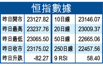 港股昨隨外圍回落,恒指昨日低開130點後,早段最多曾跌192點,低見23065回穩,午後跌幅一度收窄至20點,高見23237,收報23175,跌82點,成交484億元。