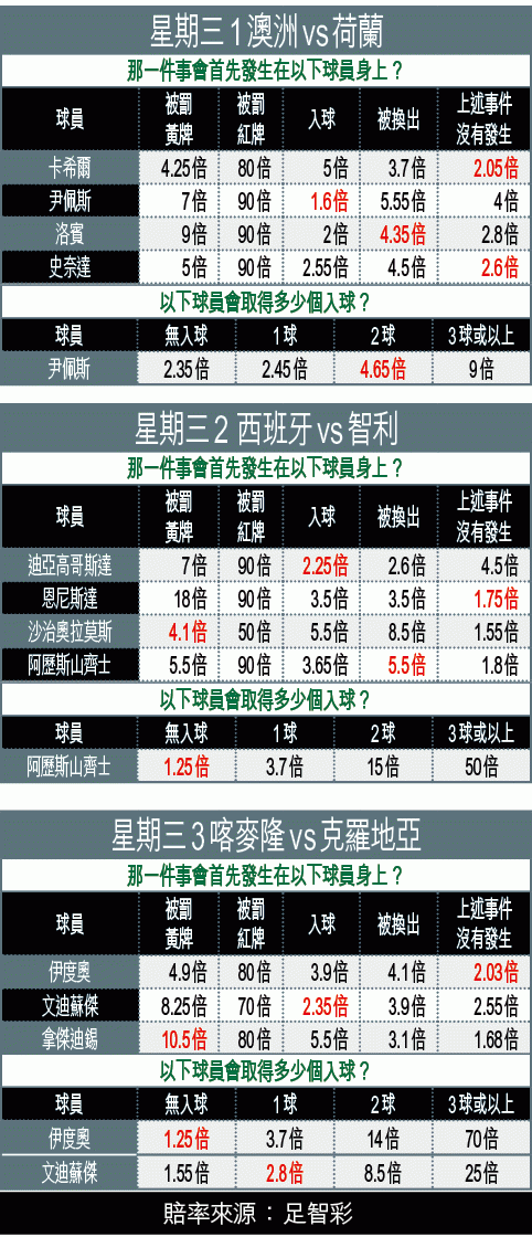 後防方面,沙治奧拉莫斯仍然輕出,踢法粗枝大葉,可取「被罰黃牌」,有4.1倍。同組另一場比賽澳洲對荷蘭,荷蘭前鋒尹佩斯回復勇態,上仗已梅開二度,今仗不妨再追4.65倍「取得2個入球」,分頭不錯。文:牽牛