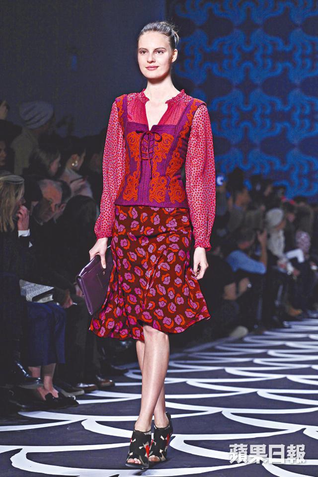 同是DvF得意之作的圖案,來季以波希米亞為靈感,恍如魚鱗的新月圖案、繁星、雲彩、午夜浪潮、玫瑰花苞、love knot圖案,以罌粟紅、彩藍、黃褐、紫羅蘭、金黃掃抹異國色彩,加入扇形花刺繡與放射式花卉寶石刺繡點綴,為簡潔輪廓注入幹勁。