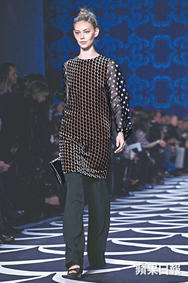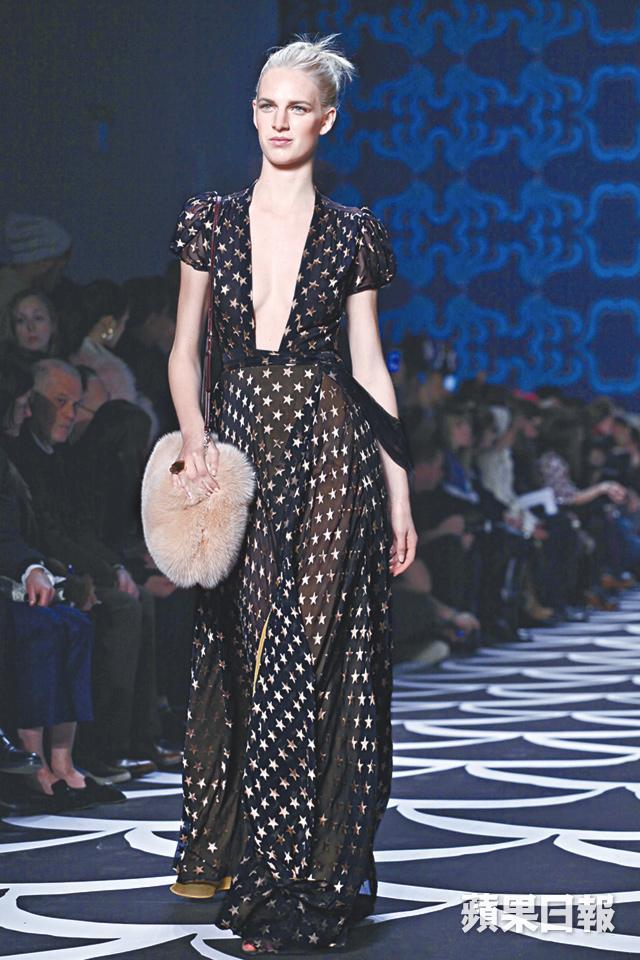 打頭陣的collared wrapdress呼應70年代的誕生原貌,忠於流麗線條的設計有flared、直身sweater dress、公主袖連身傘裙、sheath dress配透視長袖上衣、繭形外套、芭蕾舞wrap coat、corset配雪紡衫、column skirt、掛頸束腰長裙,shirtdress與soft pants則配搭出hippies glamour。