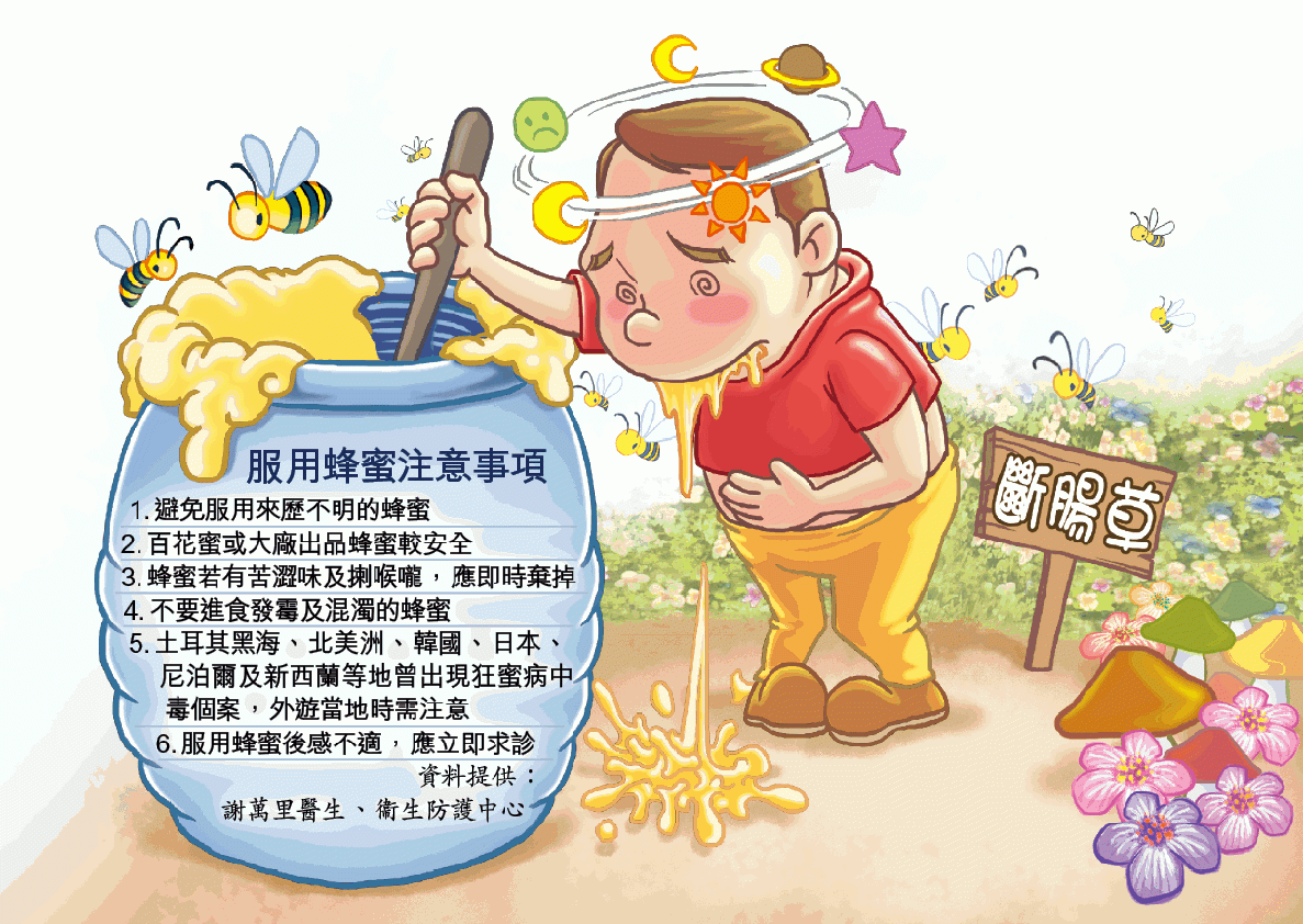 中毒諮詢中心顧問醫生謝萬里表示,本港常見的杜鵑花科植物含梫木毒素,進食有梫木毒素的蜂蜜可致狂蜜病中毒,有患者只進食五克(約一茶匙)已中毒。患者進食後一小時內會出現嘔吐、頭暈、麻痹、血壓低及心跳減慢等症狀,嚴重更會昏迷,曾有人心臟出現停頓,但本港暫未有致死個案。此毒沒有特定解藥,中毒24小時後症狀會減輕,醫生一般施以支援治療,如以阿托品藥物增強患者心跳等。