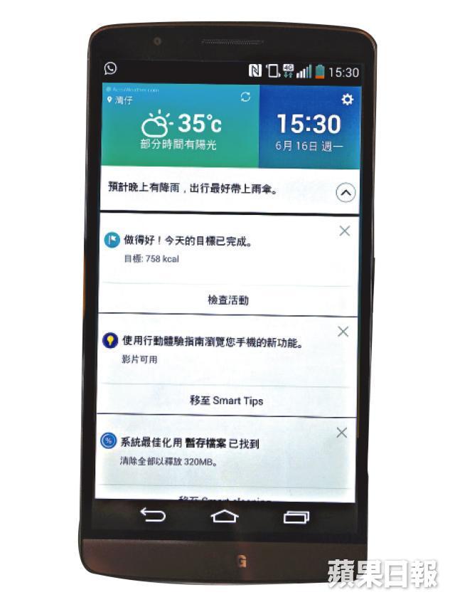 香港發佈會的重點都集中於2K屏幕、雷射對焦和手勢自拍等新功能,不過我們在新加坡早已實試介紹,比較特別是香港發佈會有重點介紹手機軟件,除了簡約的介面和圖示,還新增了LG Health和Smart Keyboard等實用軟件。LG Health主要是以速度和移動距離計算消耗的卡路里,並備有單車、跑步、遠足等設定,設計和使用方法都非常簡單易用,但相較Samsung的S Health兼具計算食物及睡眠功能,便有所不及。Smart Keyboard則可隨時設定鍵盤大小,亦可自訂常用標點於鍵盤上,以配合不同使用習慣,相當方便。