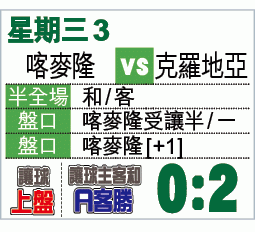 信克羅地亞可於周三打開勝門,讓半/一照捧上盤。此外,兩軍近來於半場均少交收,其中喀麥隆連續5場開「半場總入球」1球或以下,宜捧「半細」。文:青蛙仔