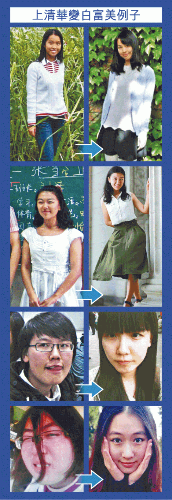 清華招生辦上周六在官方微博「清小華」轉發照片,首輯照片來自航天航空學院碩士畢業生林麗,其分別攝於她2007年入學時和今年碩士畢業時。照片所見,林入學時皮膚黝黑,但碩士畢業時已蛻變成氣質清新的白富美,令人眼前一亮。招生辦在帖中留言:「祝你在白富美的道路上一直走下去。」照片在網上惹來瘋傳,官方眼見網民回應熱烈,一方面呼籲女學生們晒照片,還「添食」上傳多名女學生的對比照片。