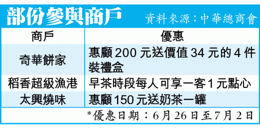 香港中華總商會昨日宣佈,將於6月26日至7月2日舉辦「慶回歸消費優惠樂悠悠」活動,有國貨公司部份工藝品三折發售、餅店惠顧20元即送生油以至酒樓早市1元點心、晚市送叉燒等優惠。