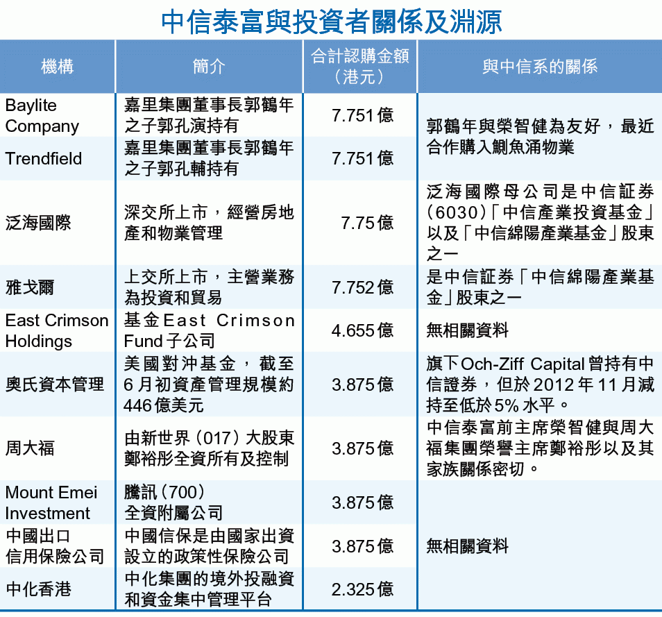 雖恃着是第一隻央企整體上市,但市場對中富泰富是次「創舉」並不受落,上月的集資亦全靠國家隊撐場,過半數的投資者為中資背景,但與原定的630億元仍有大段距離,因此中信泰富仍繼續物色投資者,除主席常振明有參與外,市場有傳聞指集團甚至動用榮智健的人脈關係,其中希望他引入早年曾是中信泰富的股東加拿大鮑爾集團(Power Corporation)。
