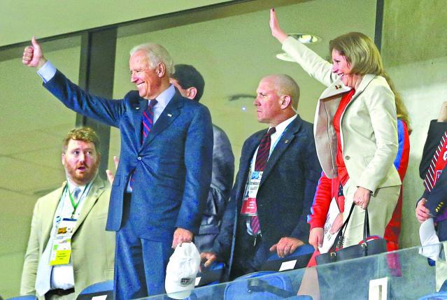 拜登(左二)投入地為美國隊打氣,更高舉拇指讚揚球隊擊敗加納。美聯社