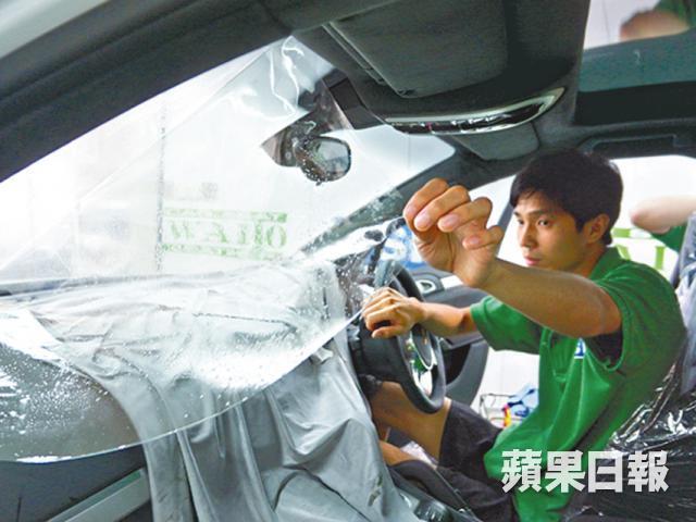 先將玻璃膜鋪在車外玻璃上量度及裁剪適中尺碼,以熱風定形。在車內玻璃上噴上𤩹水,再鋪上玻璃膜,慢慢移位。用刮刀刮走小氣泡,檢查有否內藏塵埃。