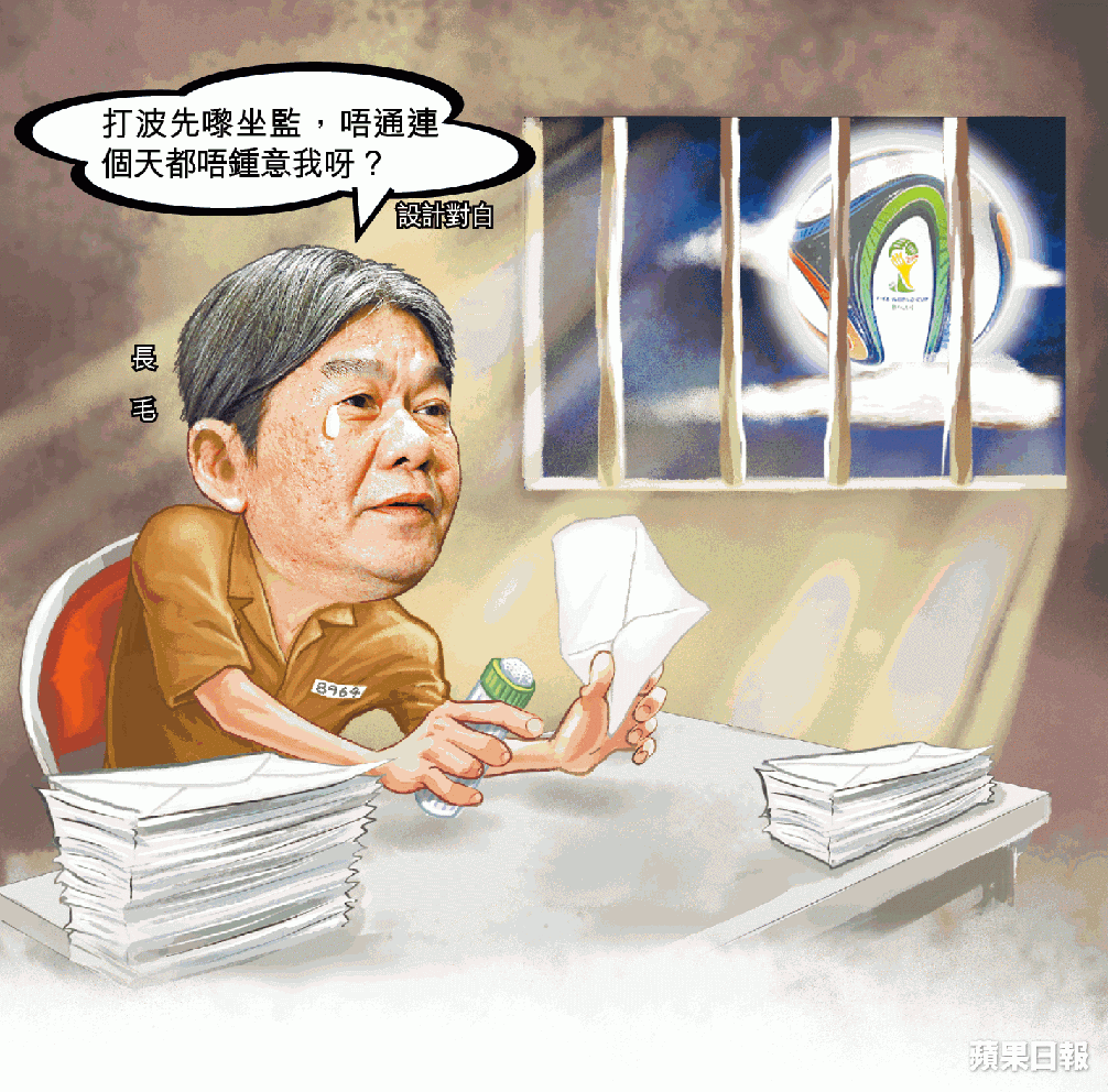 𠵱家喺荔枝角收押所坐緊政治監嘅長毛梁國雄今次可謂犧牲大,除咗被迫變短毛,同埋冇得參加6.22全民投票同7.1遊行外,身為標準球迷嘅佢仲冇得睇四年一度嘅世界盃,晚晚對住月光「坐波監」。
