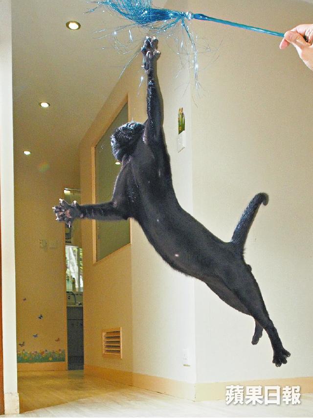 緬甸貓稱之「秘寶」,全因為保持亮麗黑髮,就得謝絕陽光。為保護愛貓「絲綢」,Phebe家中窗戶統統裝上數層薄紗。可需日日梳理?貓癡說兩款貓僅得一層貼身披毛,以手輕輕掃撥,隔日用稍濕的暖毛巾抹身即可。話音未落,一隻小黑物從沙發後高速竄出,記者數度撲地才將其按着,一摸,方知丁丁肌肉結實如磚頭,重量估計達10磅。我又趁機抱起走來湊熱鬧的毛毛,才發覺線條比粗獷型緬甸貓纖細的牠,肌肉同樣發達。原來俊美肌肉是兩貓特色和比賽中致勝因素之一,Phebe以脫水雞肉餵飼愛貓,在家亦隨處放玩具方便與牠們進行彈跳特訓。說時,毛毛已在客廳一角朝懸垂在半空的羽毛彈至一米多高。