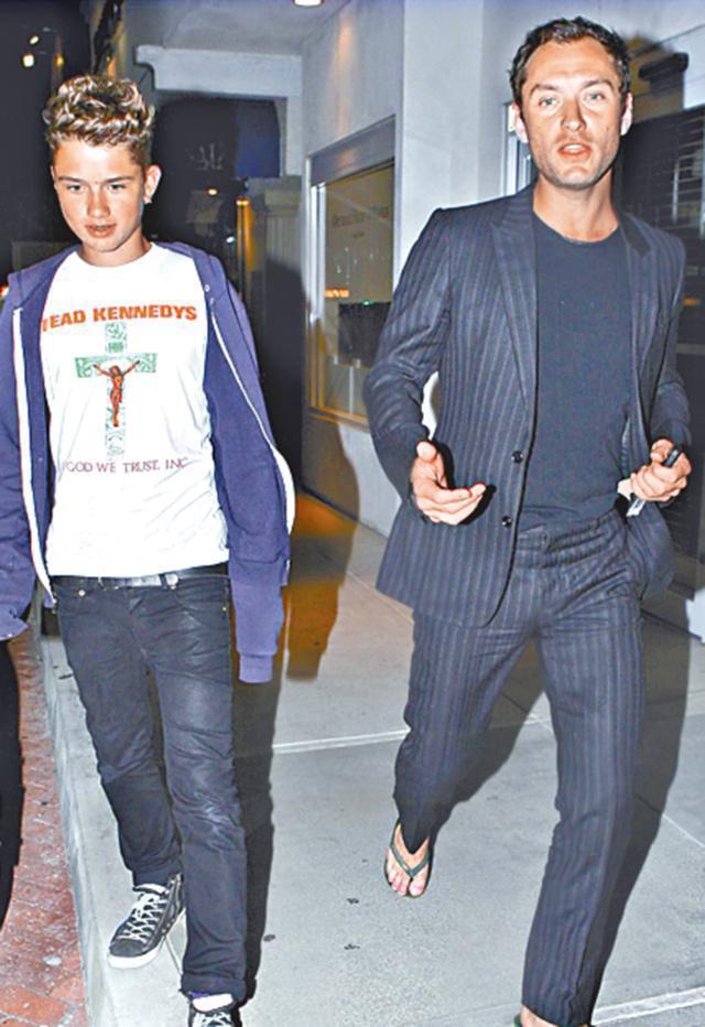 現年42歲的英國男星祖狄羅(Jude Law),雖然近年M字額問題嚴重,在女粉絲心目中的型男地位已被動搖,不過,他卻後繼有人,祖狄羅的17歲兒子Rafferty Law,前日在倫敦行天橋大受注目,曾幾何時只是不修邊幅豆𡃁的他,已搖身一變成為青春型男,樣貌更十足美國饒舌天王Eminem。