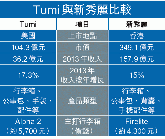 新秀麗(1910)三年前在香港上市,指出Tumi為公司在北美市場最大對手之一,公司高層更透露有意收購競爭對手Tumi。不過,隨着Tumi於2012年在美國上市,交易傳言最終流產。Tumi亞太區常務董事Tom Nelson接受訪問時指,不評論與新秀麗的關係,強調傳統上公司依靠自然增長,較少透過收購合併成長。
