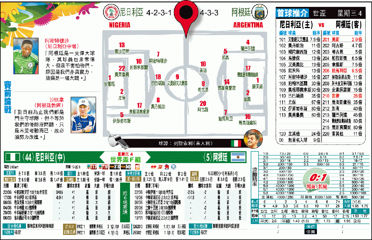 今屆世盃F組在周三進行最後一輪分組賽,榜首的阿根廷將於巴西阿雷格利鬥次席的尼日利亞。雖然被視為奪標分子之一的阿根廷,在對上兩場分組賽的表現不算突出,不過人腳始終比「超霸鷹」優勝,而且在世盃決賽周的對賽往績亦贏晒,故有力再添一場勝仗,就捧他們小勝開「讓球主客和」[-1]「和局」。(球賽編號:星期三4;無綫網絡電視13、19、now818及840台明日0:00am直播)