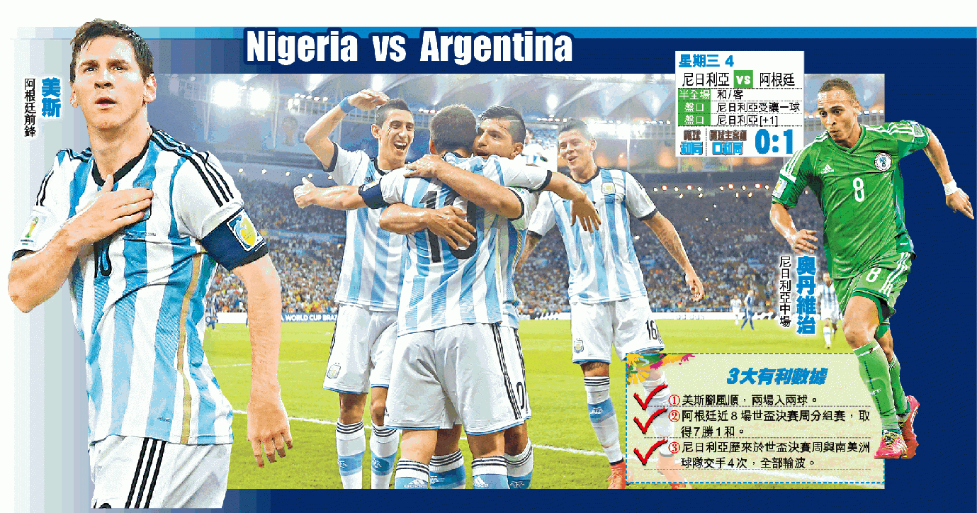 無疑阿根廷於過去兩場分組賽未能踢出強隊本色,其中上場鬥決賽周稀客伊朗,更要到補時1分鐘才入致勝球,但可以肯定是其球員的質素及經驗均一流,特別是剛於周二度過27歲生日的美斯。在剛結束的西甲,他雖表現麻麻,可是來到巴西世盃卻踢出身價波,先後以其招牌式入球射破波斯尼亞及伊朗的大門,故此,他有力為尼日利亞防線帶來威脅。