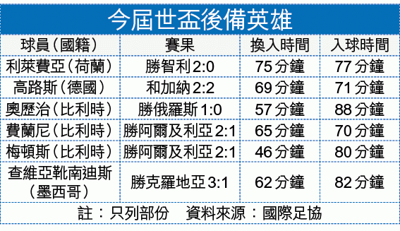 要是調動得宜,後備也可以做英雄。荷蘭中場利萊費亞周一後備落場僅90秒就入波,最終協助球隊贏智利2:0,以取得B組首名。