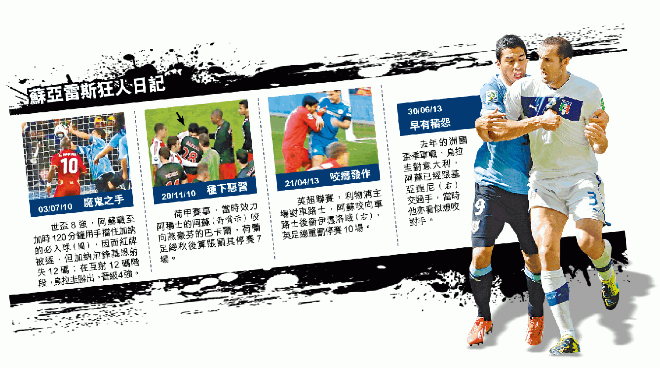 為贏波,阿蘇可以去到好盡;上屆世界盃他同樣是風雲人物,8強戰對加納,在加時最後一刻用手護空門,雖然領紅兼輸12碼,不過加納前鋒基恩射失,令烏拉圭保住希望,並戲劇性互射12碼階段勝出。奸招有回報後,阿蘇似乎「入魔」,10年11月荷甲聯賽,當時效力阿積士的他,咬向燕豪芬的巴卡爾,雖然當時也逃過球證法眼,但被荷蘭足總秋後算賬,罰停賽7場。上年4月英超聯賽,效力利物浦的蘇亞雷斯,咬向車路士後衞伊雲洛域,被英足總罰停賽10場。不過阿蘇死撐咬人有理,他賽後說:「這些事件在比賽經常出現,當時我們有身體接觸,我的下巴與他的肩膀碰了一下。」隊友盧根奴說:「基亞連尼不似一個大男人,只向球證投訴,我認為他展示的只是舊傷痕。」