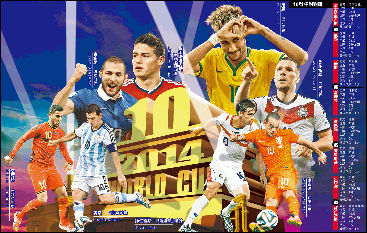 自球王比利以後,10號球衣便成為一種象徵,代表球隊入面最好波的球員。今屆世盃8強,8位技術出眾的10號仔聚首一堂,帶領各自的球隊衝擊冠軍。在他們當中,占士洛迪古斯暫時技壓群雄,領先射手榜。今日,他將率哥倫比亞出戰巴西,與巴西的10號王牌尼馬一較高下。