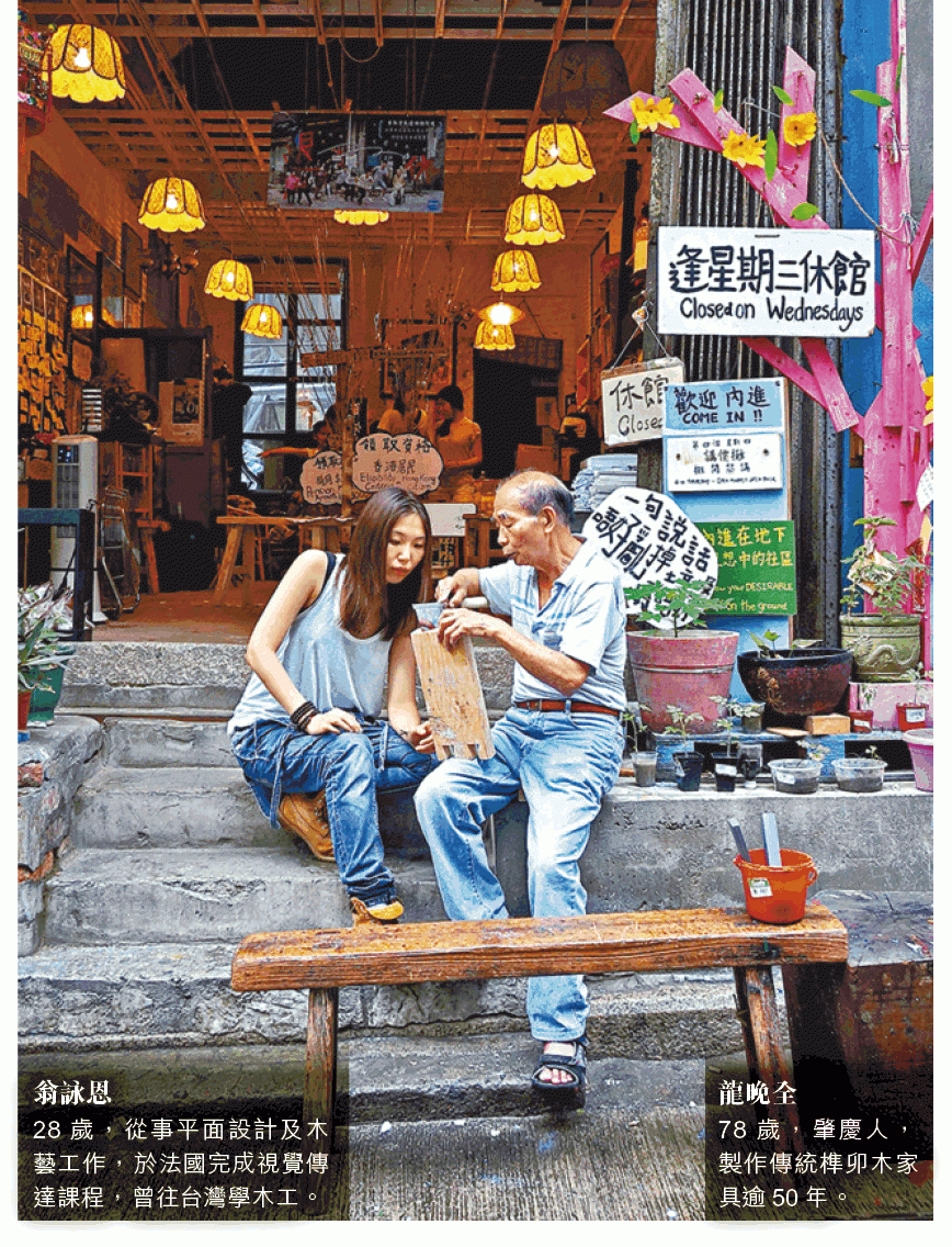 灣仔藍屋門前有一個叔叔叫龍仔,整日為街坊修理木家具。這種陳年木家具,靠榫位連繫部件,不用一口釘。可惜師傅所剩無幾,龍仔退而不休都年近八十。半年前,他身旁多了位年輕女子阿恩,據說是他畢生唯一入室弟子。路過的街坊指着她罵:「法國讀完視覺傳達課程,返嚟又踎喺度鋸木,一世冇前途啊!」她說:「如我不帶頭學,這種工藝就失傳了。」這種剛被列為世界非物質文化遺產的工藝,難得有年輕人承繼衣鉢。