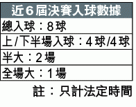 如果世盃季軍戰是入球「大」的保證,那麼決賽的常識便是「細」吧!獎盃就在眼前,成績來得比華麗、娛樂性重要,所以緊湊而不精采,是世盃決賽的最好寫照。近6屆決賽,有3次要戰至加時,當中兩次更要去到互射12碼,可見球隊不會貿然進攻,因為一子錯,滿盤皆落索!正因這原因,近6屆決賽只有1場的總入球,是多於兩球(98年)。6場合計只入了8球,平均不足1.5球(只計法定時間)!作為球迷,當然希望多些入球。不過智勝雙雄告訴大家,今場看來也逃不過入球「細」的命運!