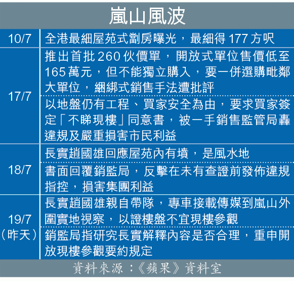 長實賣嵐山要求準買家簽定「不睇現樓」同意書,全城圍攻,遭一手銷售銷監局轟損害買家利益兼違規,要求長實解釋。長實則引用一手新例中的條款作反擊,指樓盤仍有工程進行,安全至上,安排現樓參觀屬「並非合理地切實可行」,只要準買家書面同意便毋須開放物業供參觀,強調集團並沒有犯例,並反駁銷監局的違規指控欠事實根據,損害集團利益。