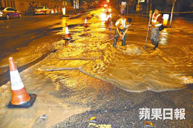 【本報訊】沙田大圍車公廟路與顯徑街交界,昨凌晨零時,一條直徑200毫米的地底喉管突然爆裂,大量食水湧出,造成面積10米乘10米的路面損毀,現場出現水浸,同時導致顯徑邨、名城、嘉田苑、徑口路及顯田泳池等都沒有食水供應。大批居民狼狽到街上水車取水,有食肆整天無法營業,損失慘重。