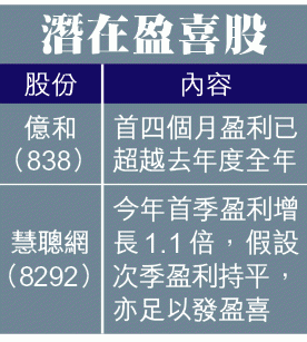 發掘潛在盈喜股,主要途徑都是參考過往業績或通告,計算即將發佈的業績,有否爆破性增長,工業股億和(838)以及科網股慧聰網(8292),同樣有報喜潛質。