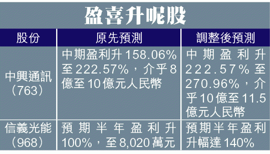 公司發盈喜反映業務改善,發完盈喜後再向上修訂盈利預測,這類升呢股更值得留意,中興通訊(763)及信義光能(968)便是近期最佳例子。